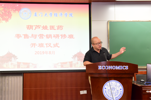 在开班仪式上,廖景峰主任首先代表厦门大学经济学院热烈欢迎yp街机医药零售与营销研修班的学员到厦大学习,并就厦门大学及经济学院的相关情况进行了介绍。他说,yp街机学员走进厦大就是厦大的校友,希望未来的日子能够关心、支持母校的发展,多提宝贵意见,同时他也祝大家在厦大学习期间学有所成、学有所获。